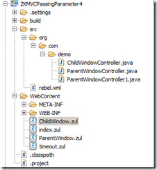 Now we will add our controller to our Parentwindow.zul as follows. Create a package called "org.com.demo" and create a java file called "ParentWindowController.java" Now on button click, we will call the ChildWindow.zul with the arguments as shown here.
